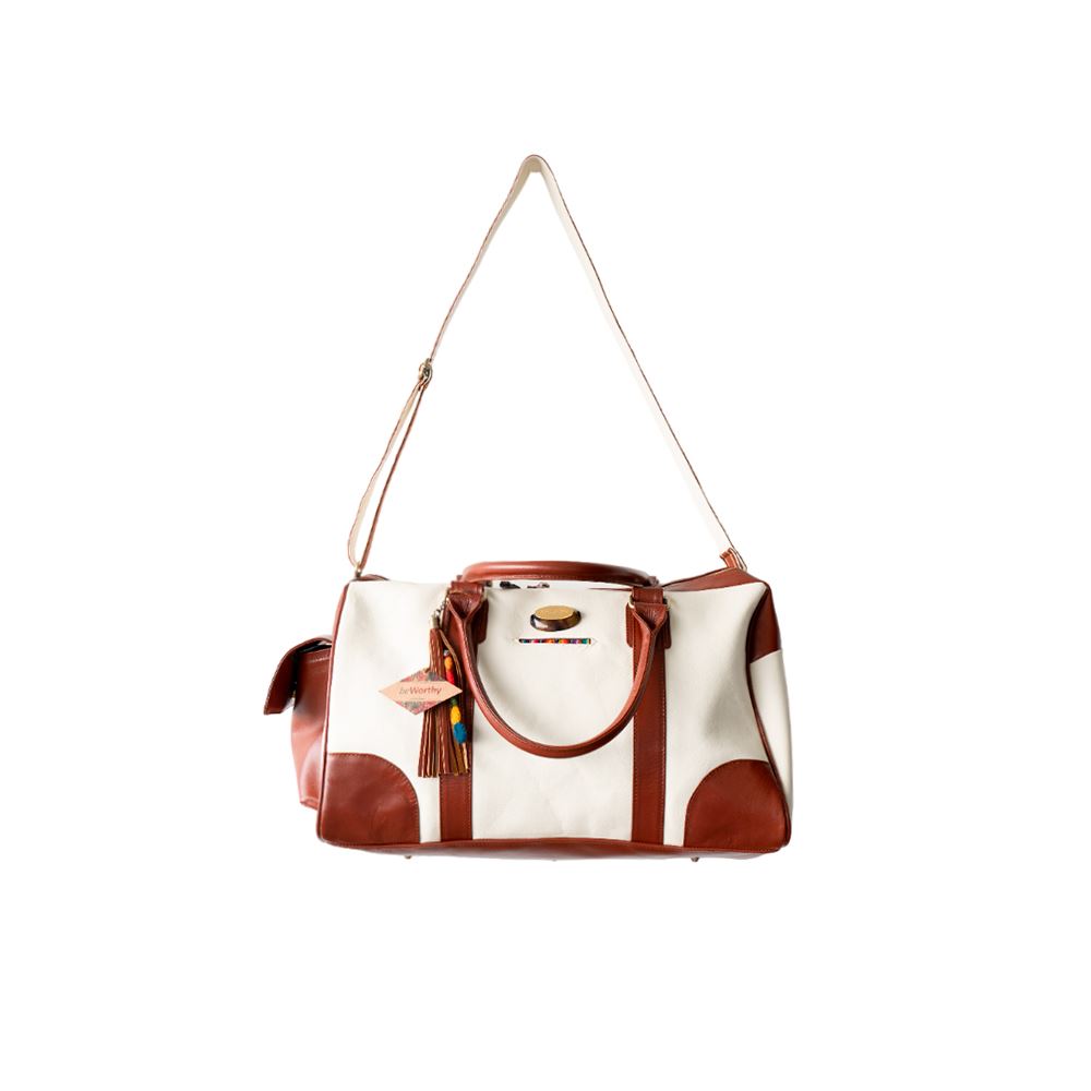 Maletín de viaje beWorthy, mediano, unisex, de cuero color hueso con cuero color camel