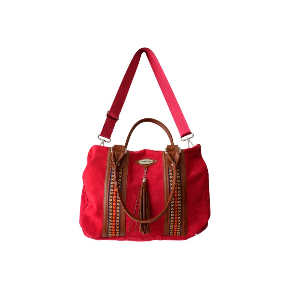 Maletín de viaje beWorthy, mediano, unisex, de gamuza roja con greca incaica de algodón y detalles en cuero camel