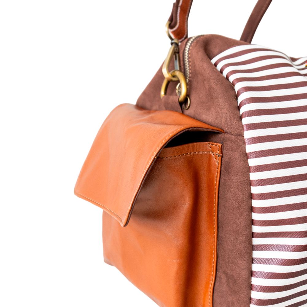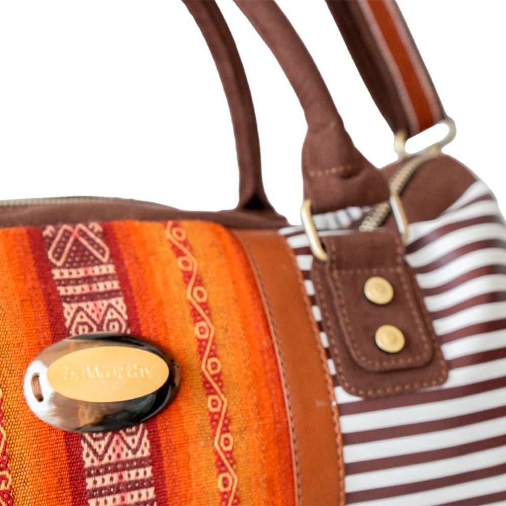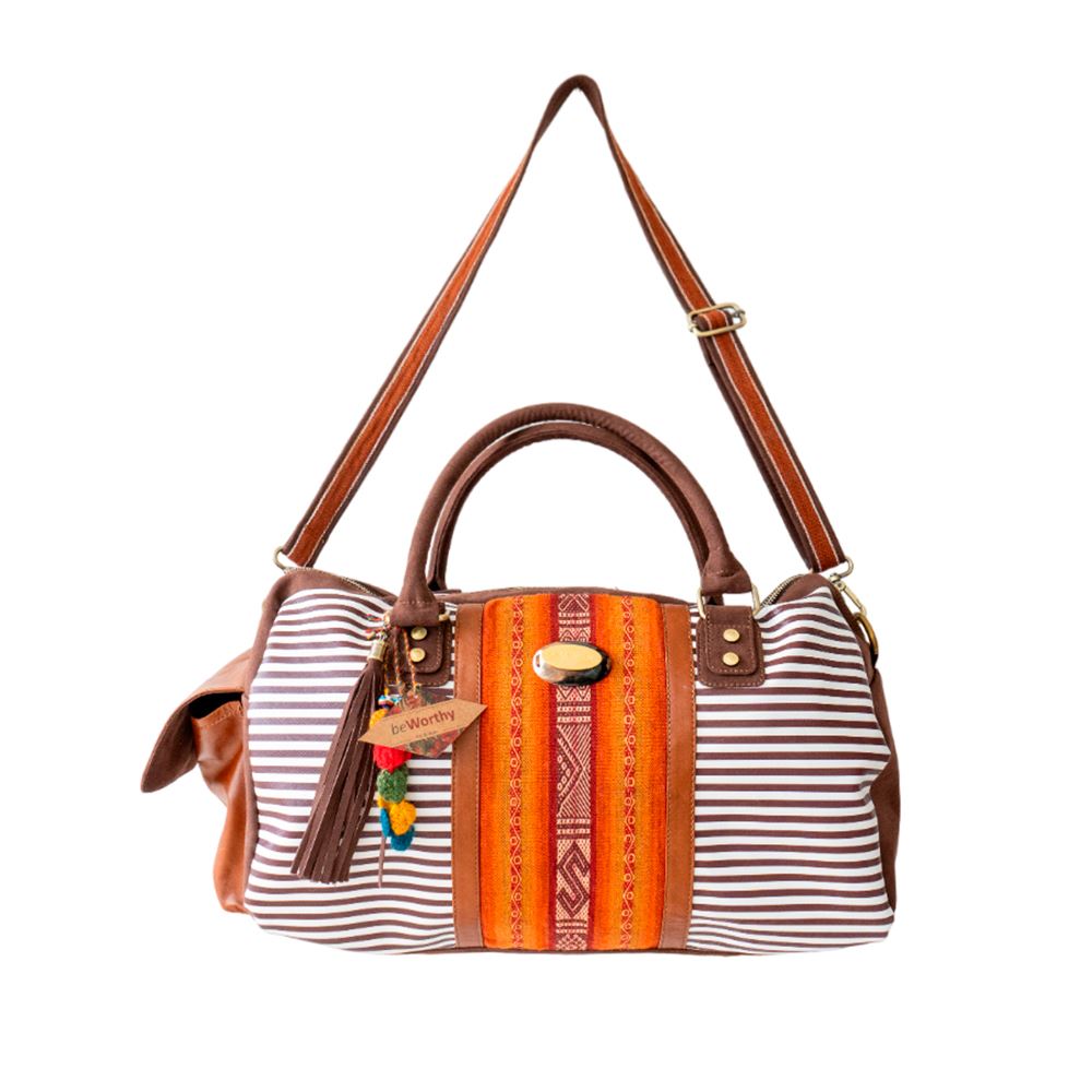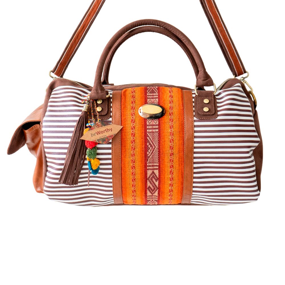 Maletín de viaje beWorthy, mediano, unisex, de telar incaico con lona plastificada a rayas y cuero camel