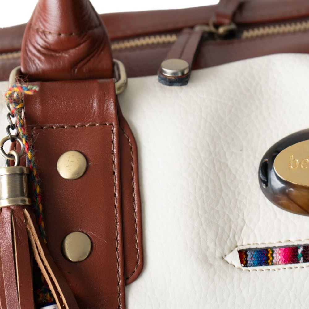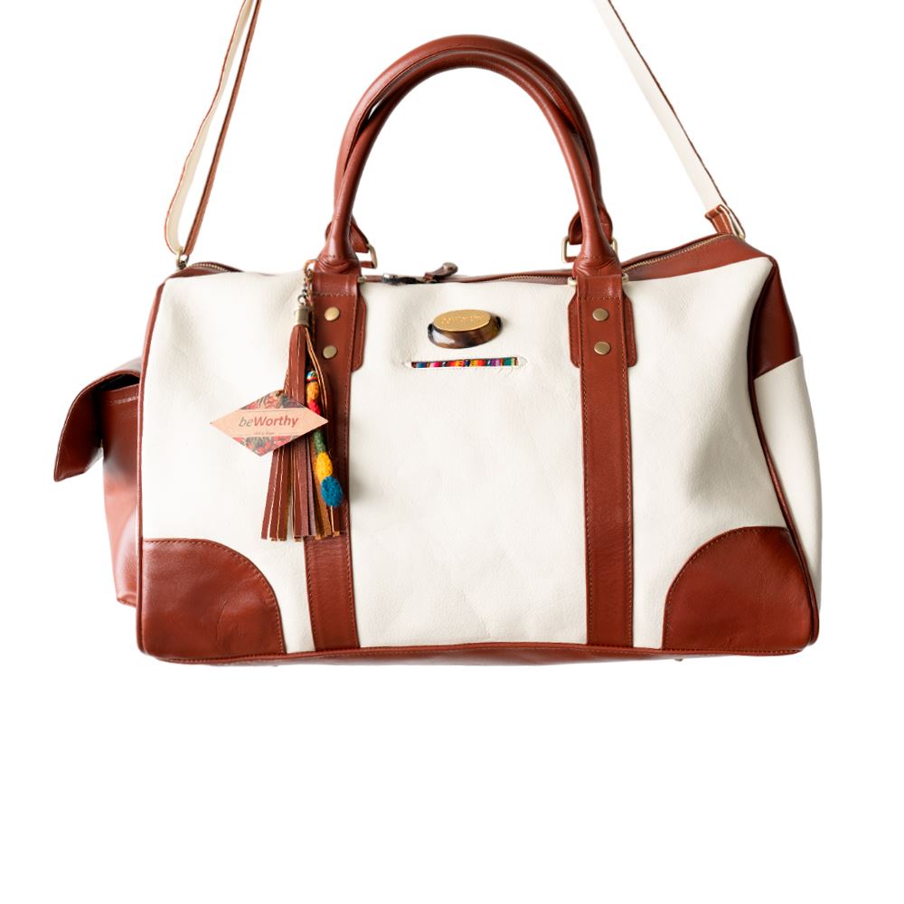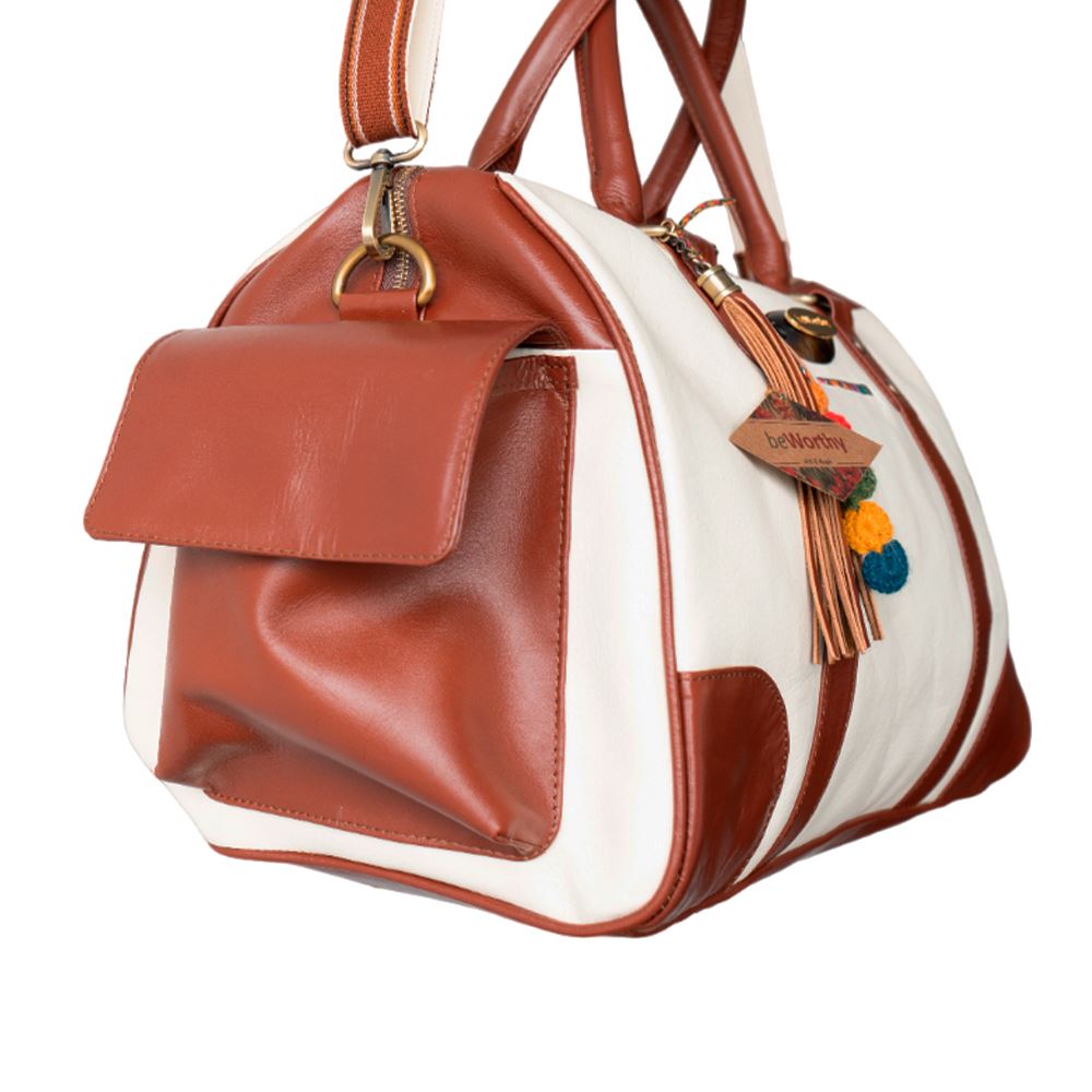 Maletín de viaje beWorthy, mediano, unisex, de cuero color hueso con cuero color camel