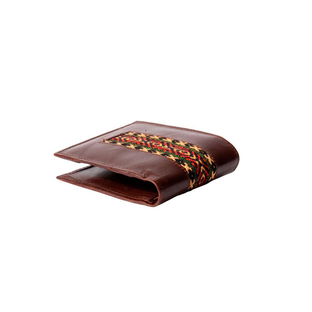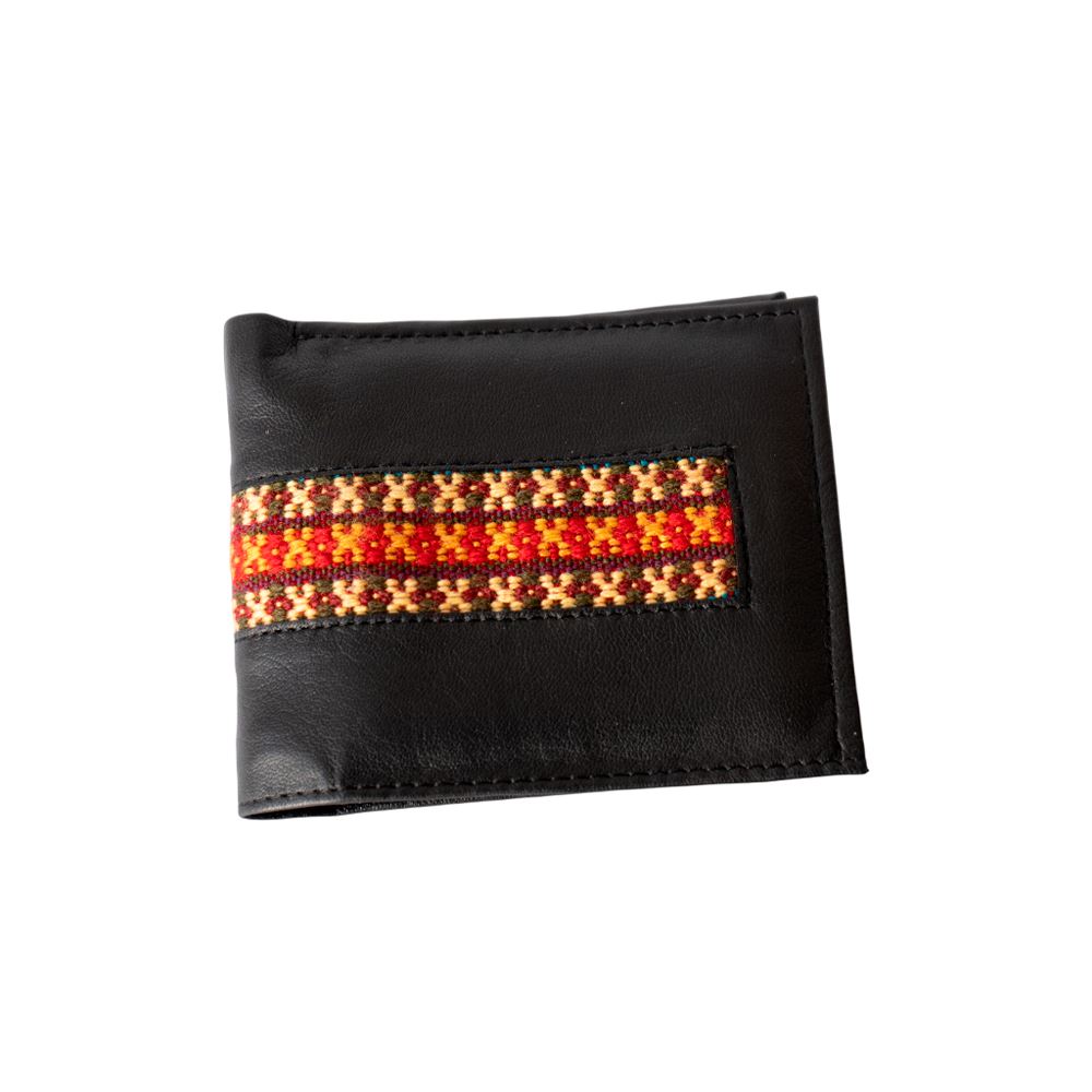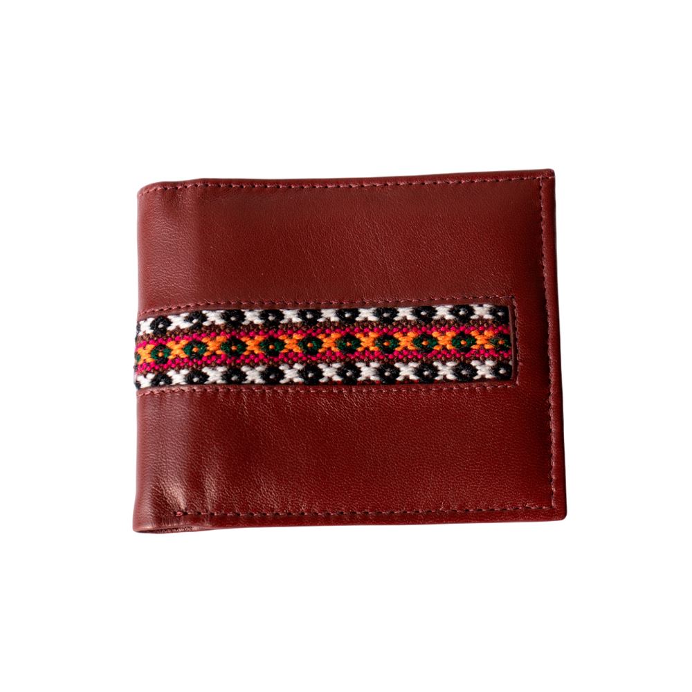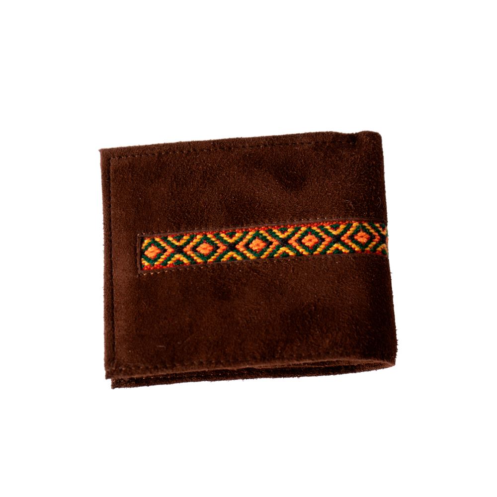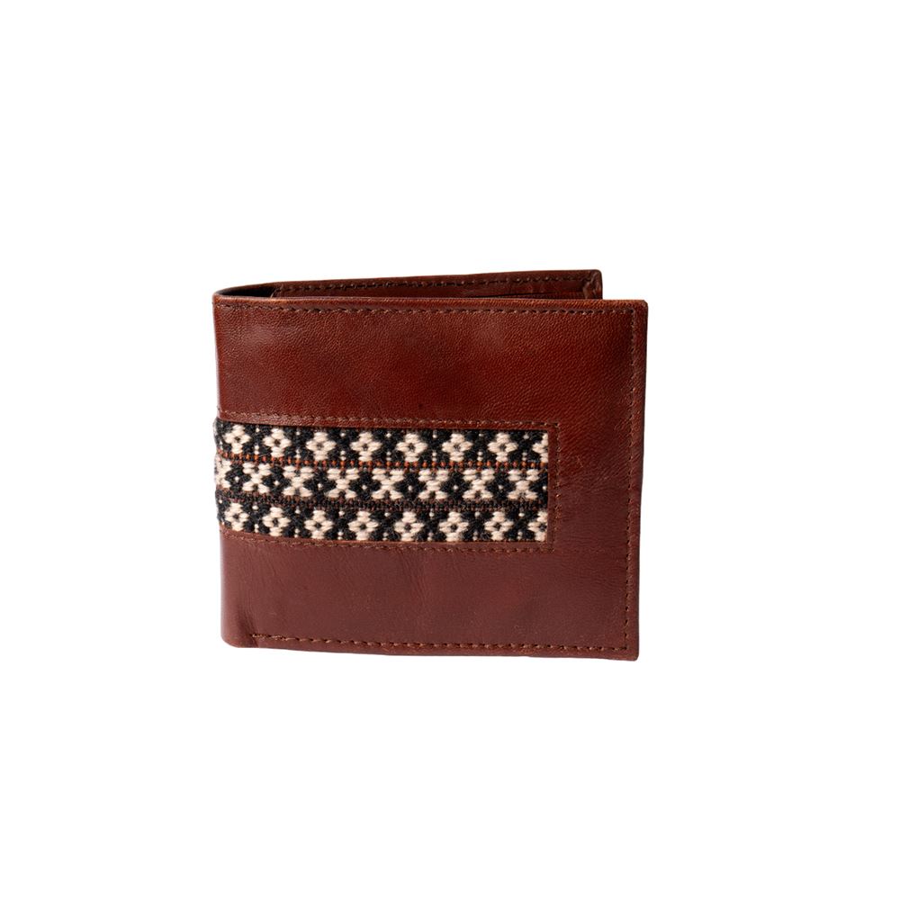 Billetera para caballero beWorthy, de cuero o gamuza (material y color a elegir), con detalle en greca incaica de lana de oveja