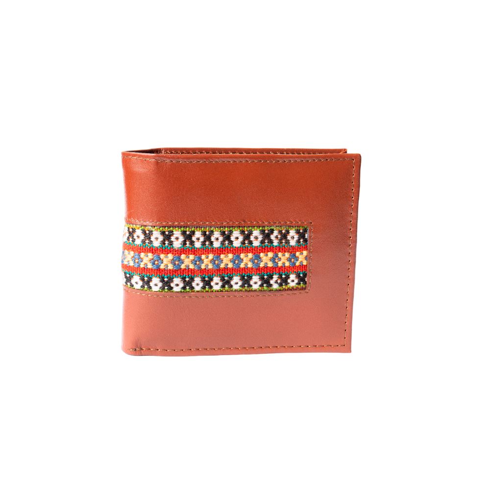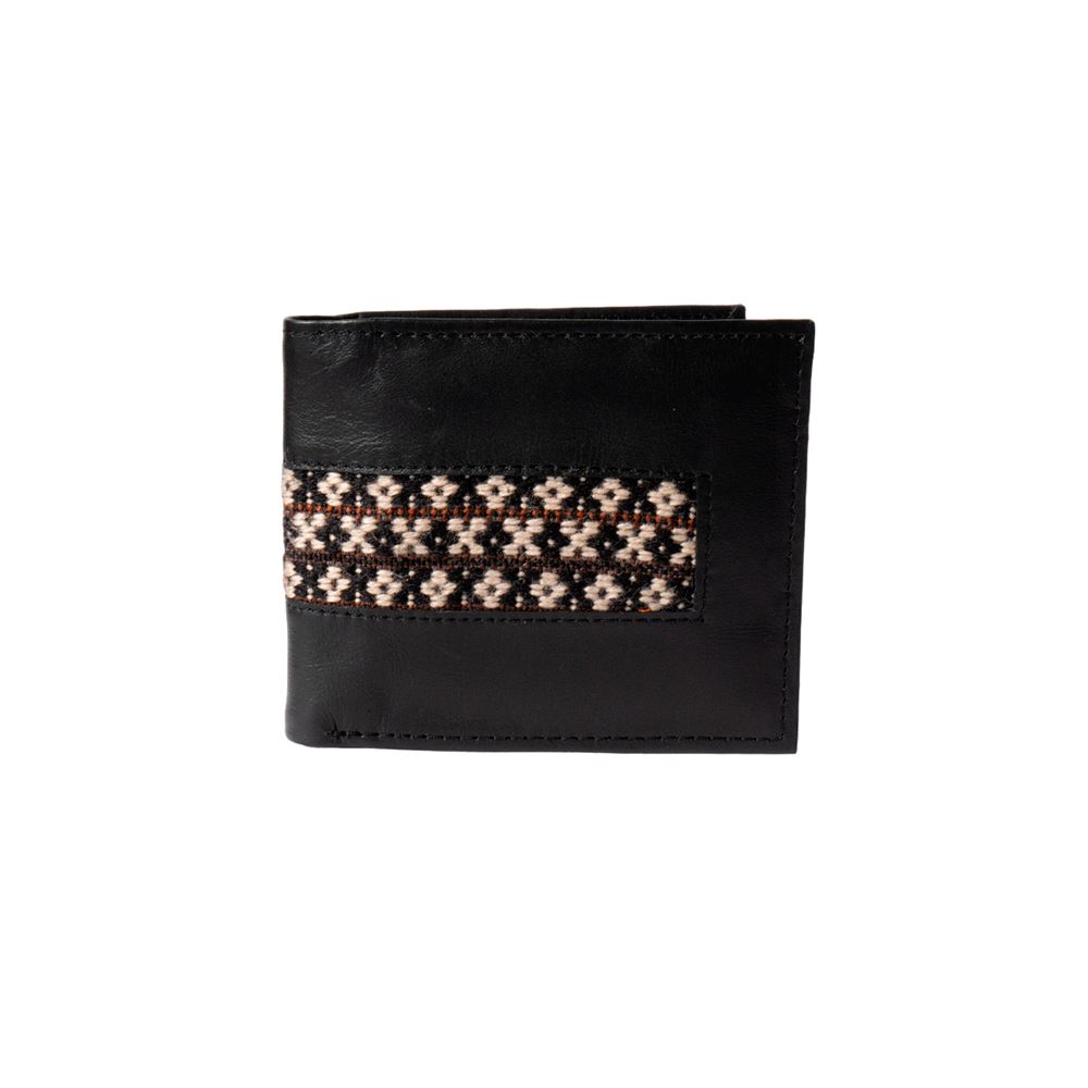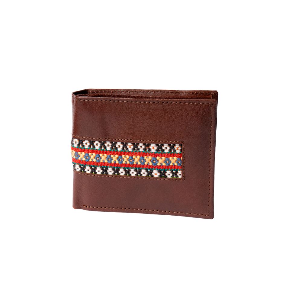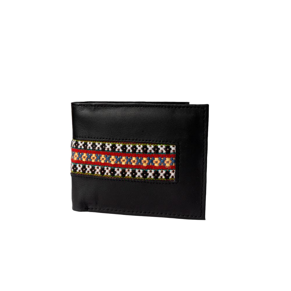 Billetera para caballero beWorthy, de cuero o gamuza (material y color a elegir), con detalle en greca incaica de lana de oveja