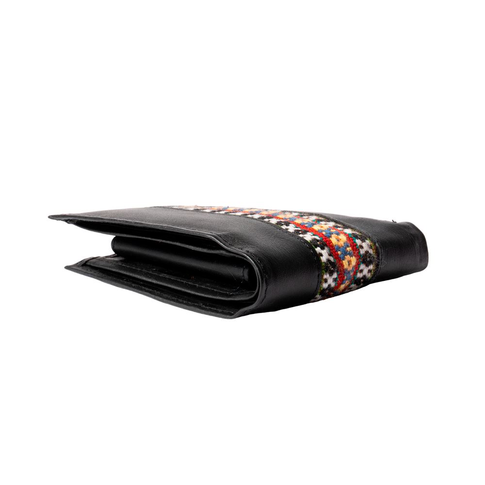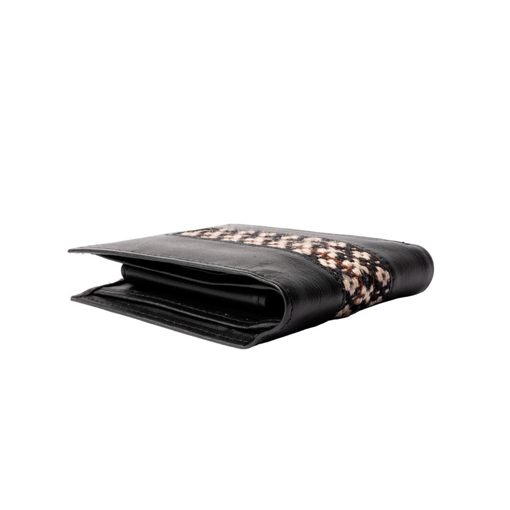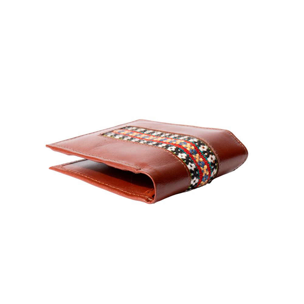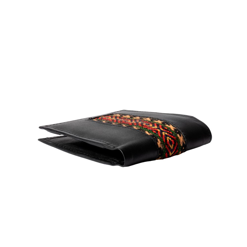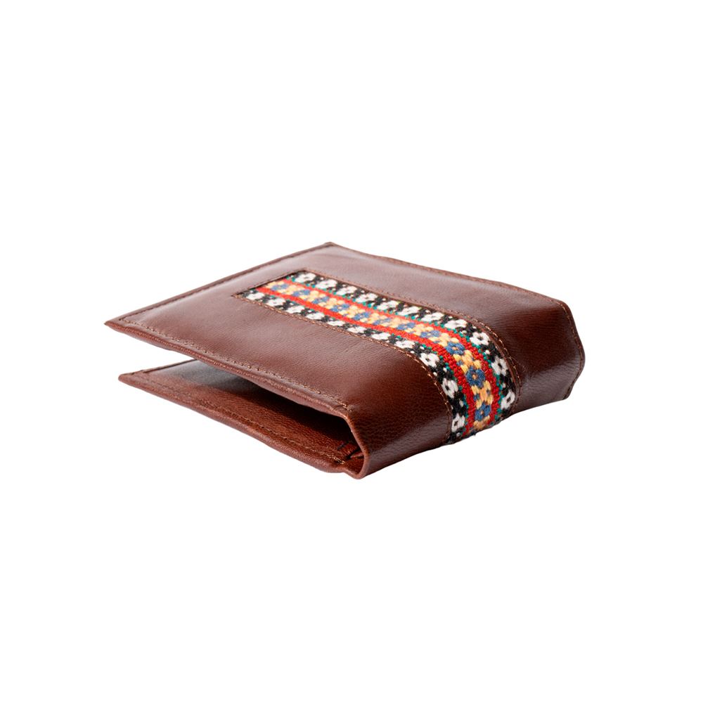 Billetera para caballero beWorthy, de cuero o gamuza (material y color a elegir), con detalle en greca incaica de lana de oveja