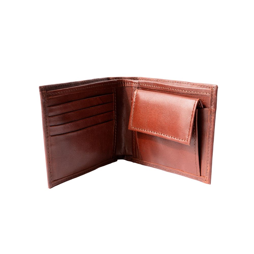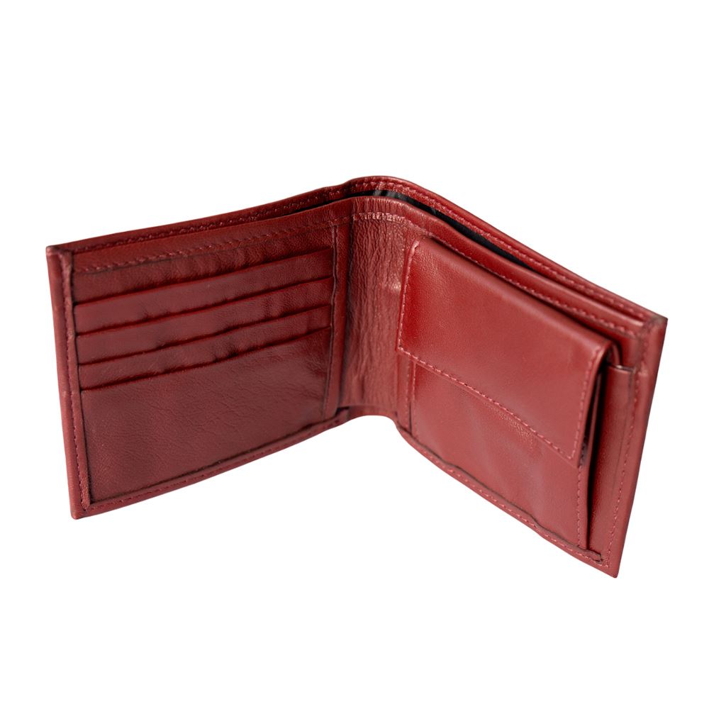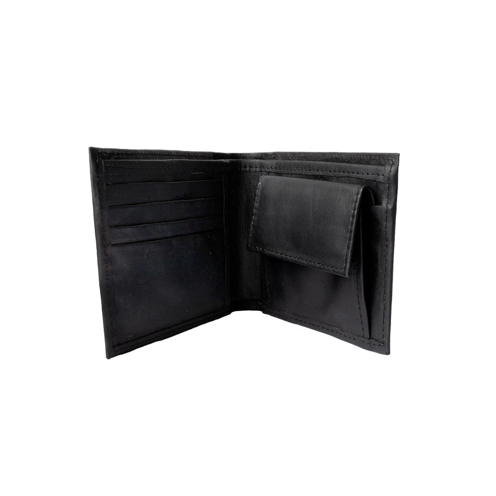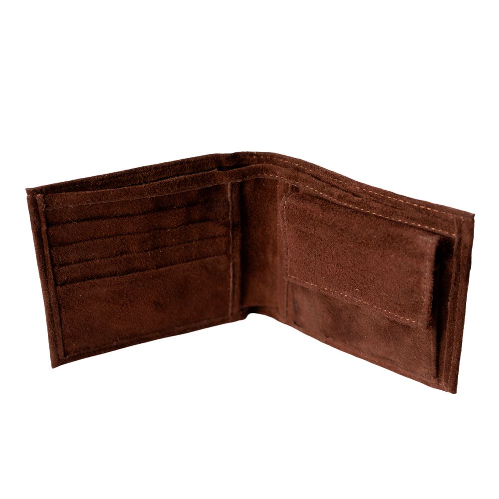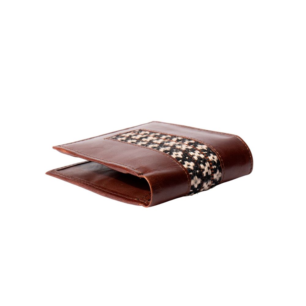 Billetera para caballero beWorthy, de cuero o gamuza (material y color a elegir), con detalle en greca incaica de lana de oveja