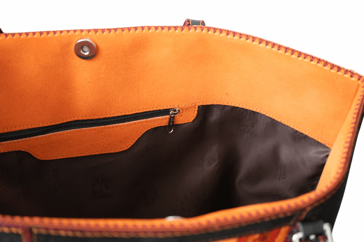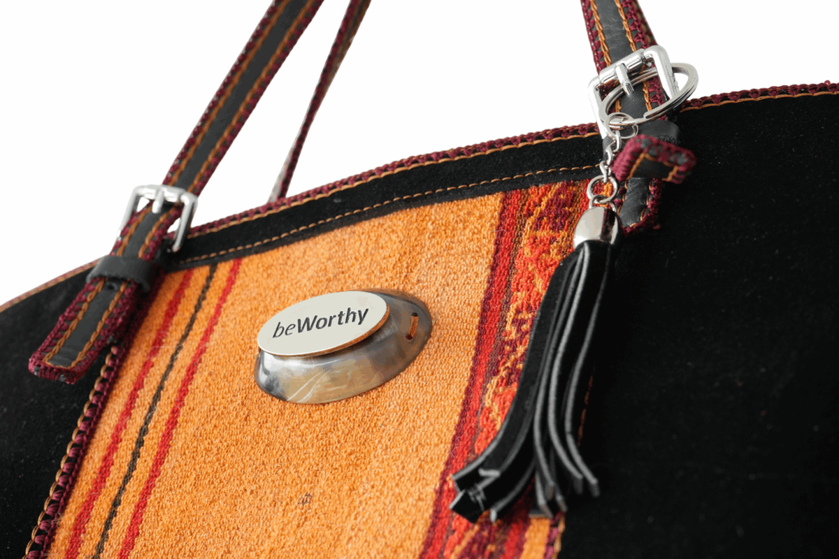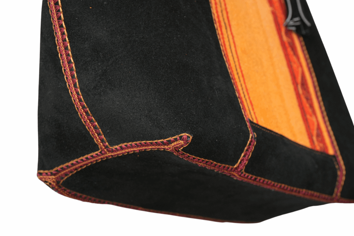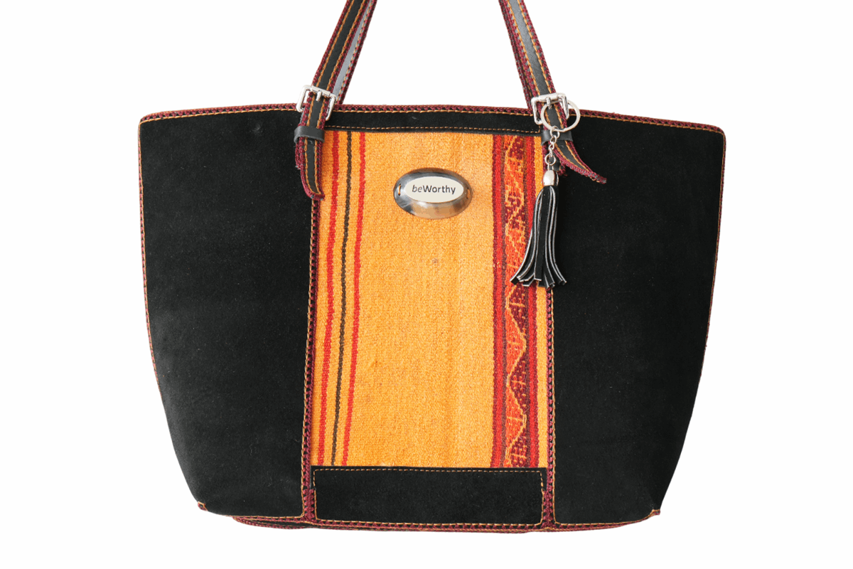 Cartera beWorthy de gran tamaño, en gamuza negra y telar incaico de lana de alpaca y oveja en tonos salmón y ocres