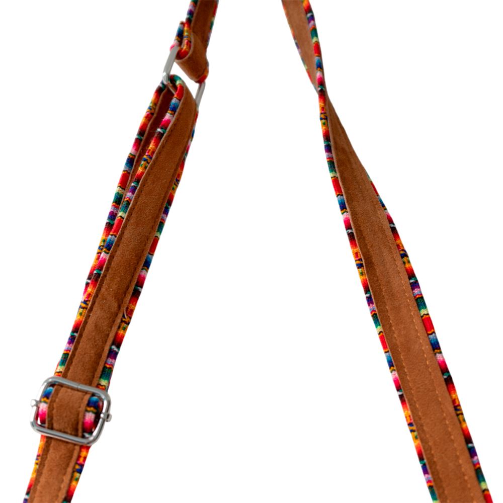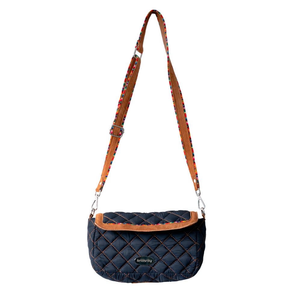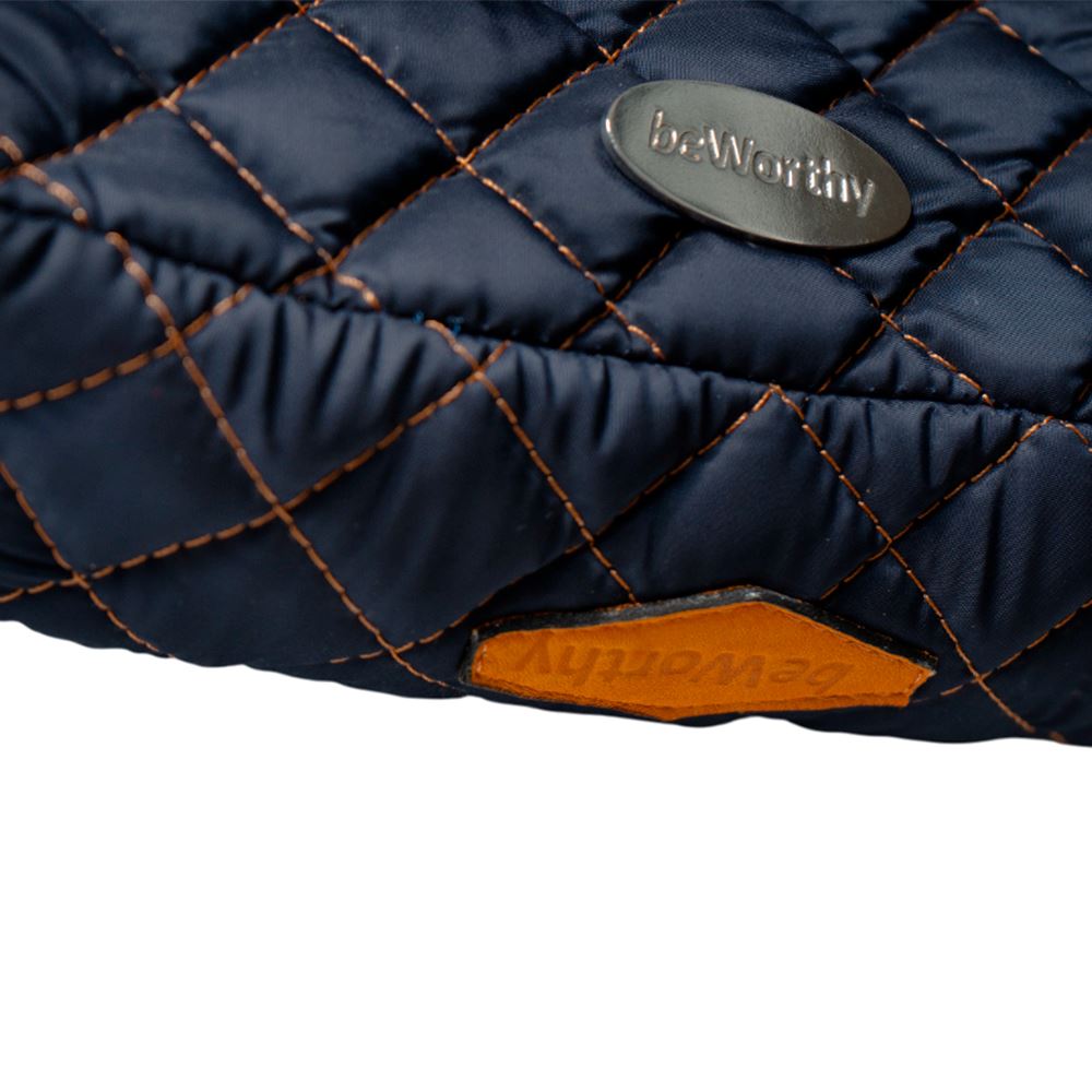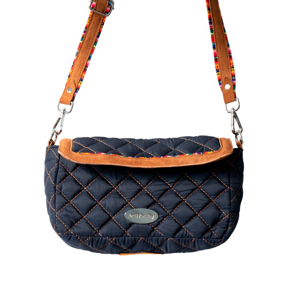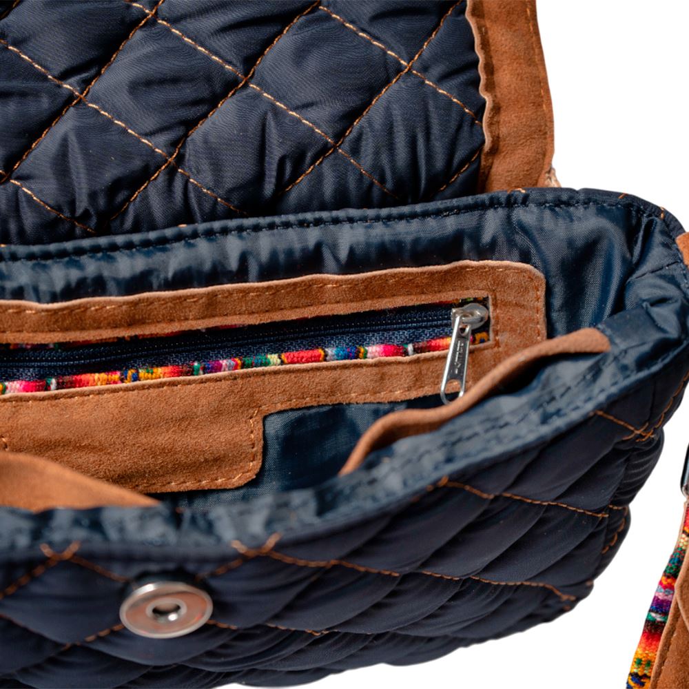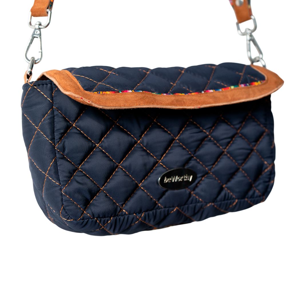 Cartera beWorthy pequeña, en tela bomber de nylon azul, acolchada, y detalles en gamuza camel y tela incaica acrílica