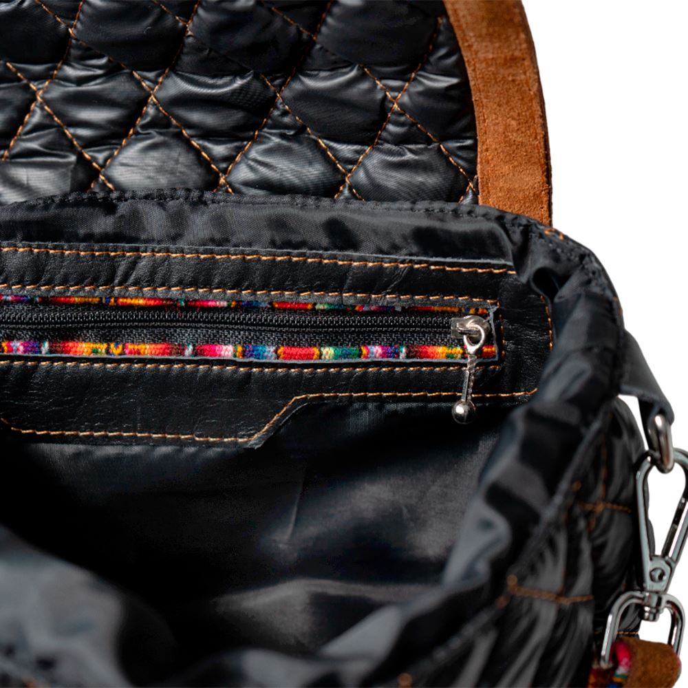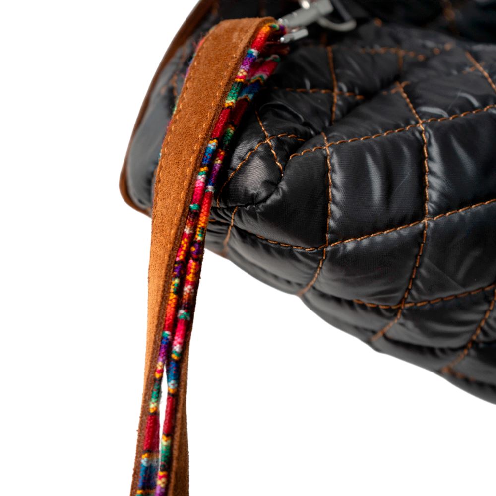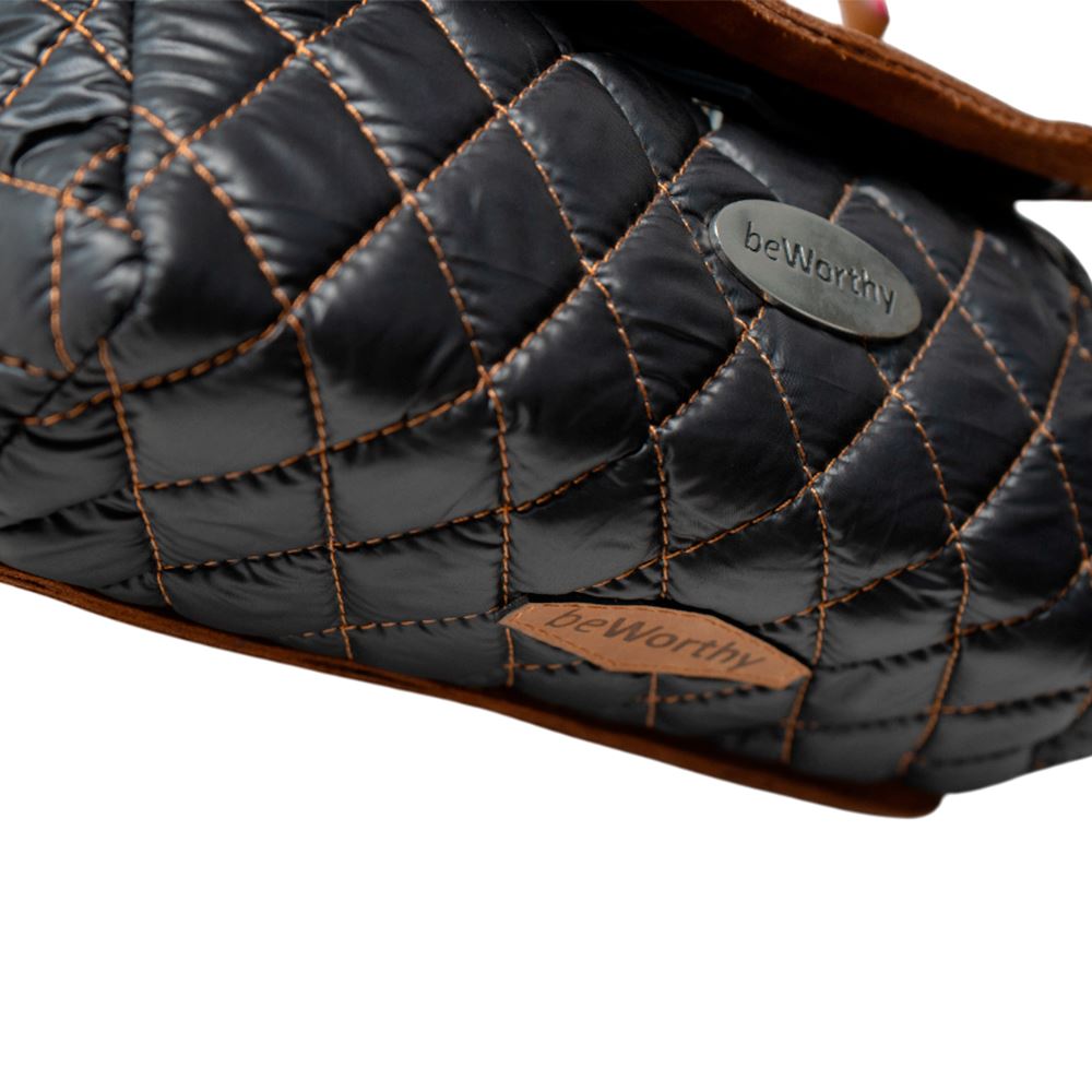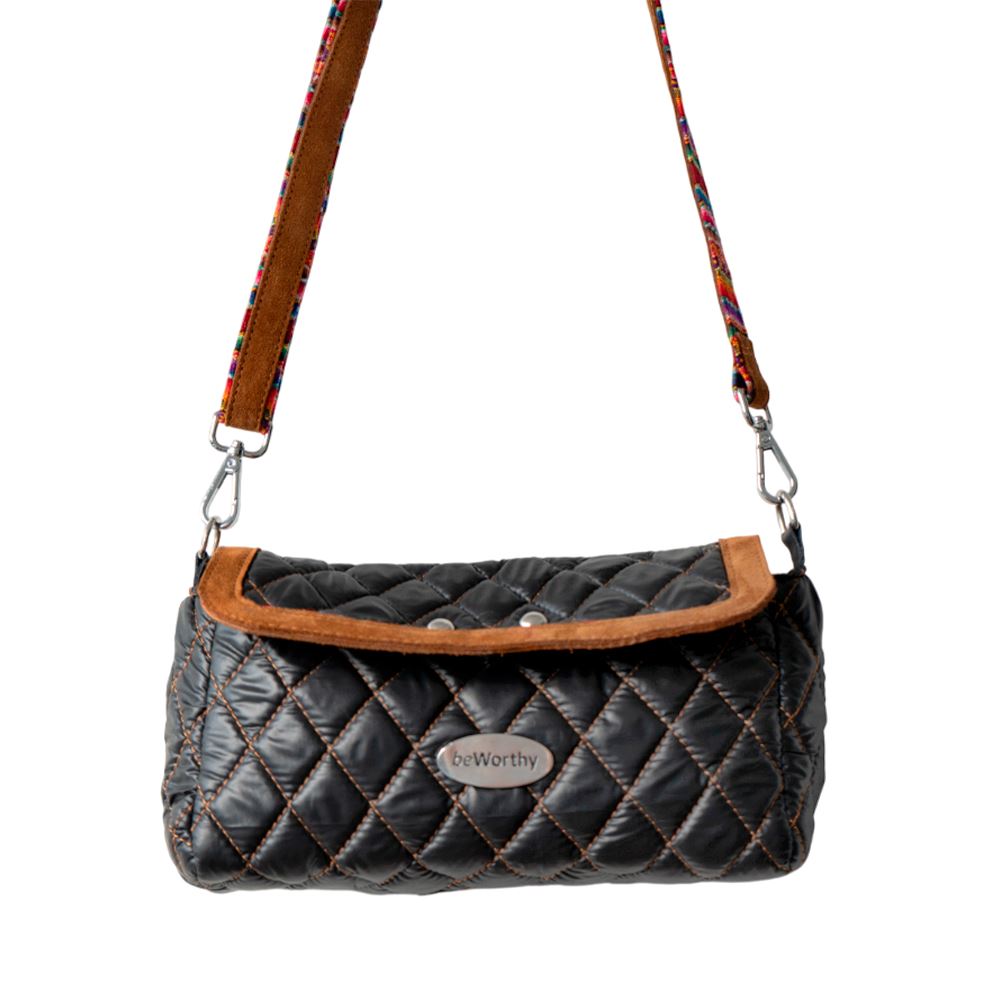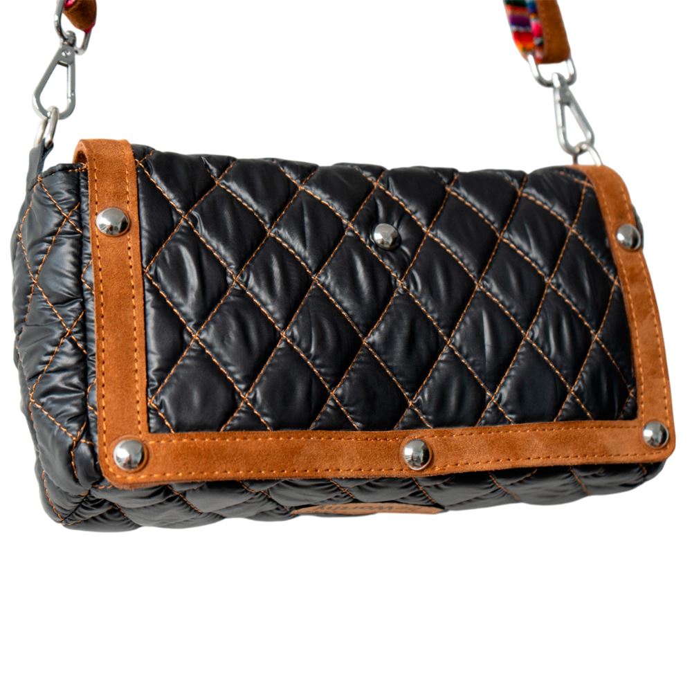 Cartera beWorthy pequeña, en tela bomber de nylon negra brillante, acolchada, y detalles en gamuza camel y tela incaica acrílica