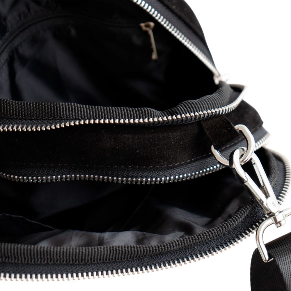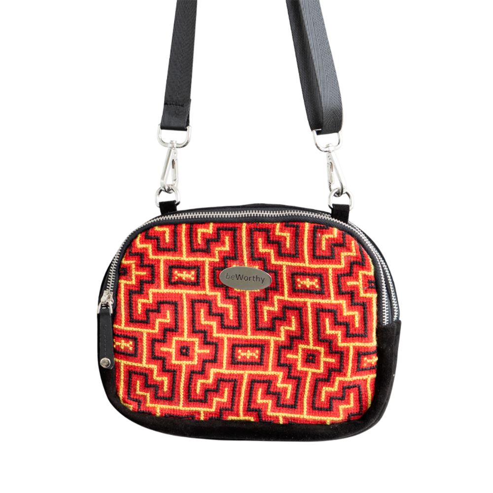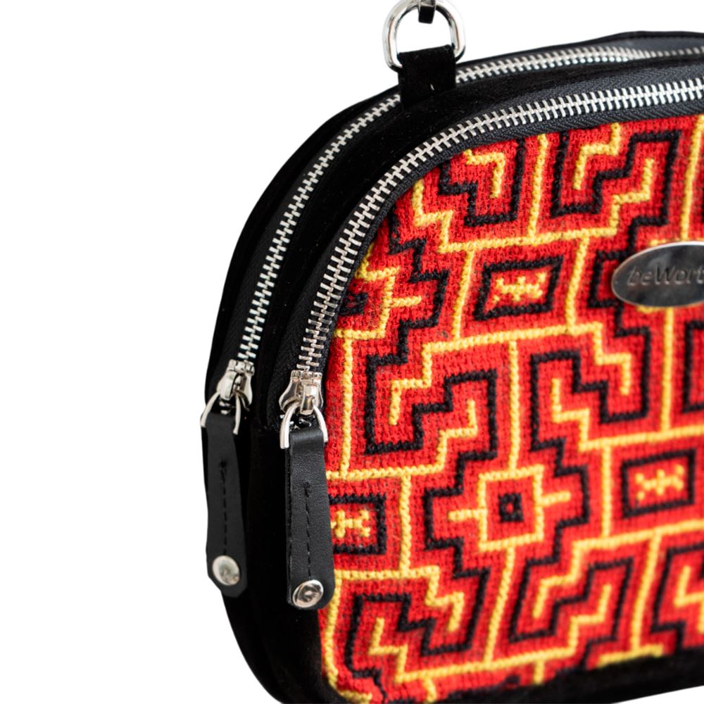 Cartera beWorthy de tamaño mediano, en gamuza negra y retazo de manto Shipibo-Konibo bordado a mano
