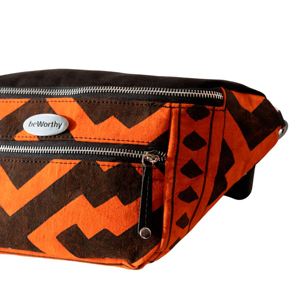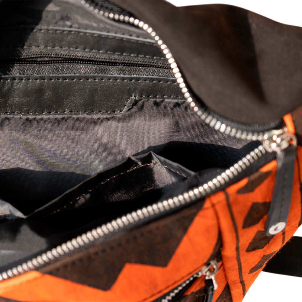 Canguro mediano beWorthy de tela Shipibo Konibo, en tonos naranja y negro, pintada a mano, con gamuza negra